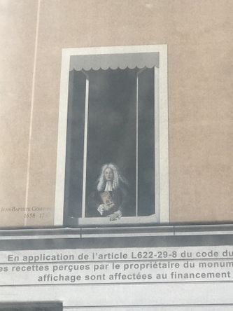 Mais avant toute chose, il serait intéressant de commencer cette présentation en évoquant JeanBaptiste Goiffon… Quelques années en arrière, on a pu voir son effigie, Place Bellecour : des façades d’immeubles y sont restaurées et les travaux sont masqués par d’immenses bâches, tendues du haut en bas des échafaudages. Des publicités figurent dessus : un emplacement de choix pour des grandes marques qui veulent entretenir leur prestige et un revenu non négligeable, qui sert à financer une partie de la restauration. Dans un coin de la bâche, une fenêtre peinte en trompe-l’œil, où l’on peut voir ce personnage.