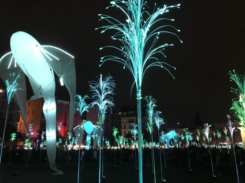 La fête des lumières de Lyon se déroule sur 4 jours autour du 8 décembre, chaque année. Des spectacles peuvent y être admirés à tous les coins de rue : projections/animations sur les façades, œuvres lumineuses fixes ou mouvantes, de toutes tailles… La ville entière est transformée en salle de spectacle. Un immense périmètre autour du centre ville est rendu uniquement piéton. Et pour cause : la foule qui déambule est tellement dense qu’il serait impossible (et dangereux !) pour quelque véhicule que ce soit de se déplacer. Il est difficile de donner un chiffre précis de fréquentation. Selon le magazine Ca m’intéresse : « Son succès est indéniable avec 4 millions de participants environ à chaque édition. Ce chiffre en fait le quatrième événement festif au monde en terme d’affluence, après le pèlerinage dans le Gange, le Carnaval de Rio et l’Oktoberfest à Munich. » (https://www.caminteresse.fr/culture/quelle-est-lorigine-de-la-fetedes-lumieres-1174863/)